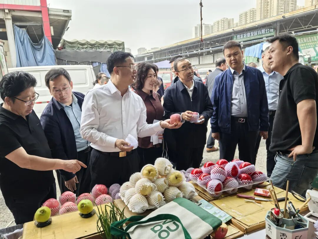 为进一步推动静宁苹果“南下西进东扩”,拓展西南大市场,继4月12日在成都举行“静宁苹果”甘味出陇成渝行暨产业链招商引资推介活动后,4月13日,市政府副市长何鹏峰带队在重庆双福国际农贸城考察,与当地协会、市场管理组织和企业、商户座谈交流,深入了解“静宁苹果”在重庆市场认可、销售份额和服务需求,共商合作发展之策。中国苹果产业协会会长杨易、党支部书记陈瑞剑,静宁县“归雁工程”重庆联络站站长王武斌,市政府相关副秘书长,市林草局主要负责同志,7县(市、区)政府分管负责同志、林果部门负责同志、平凉有关农产品交易中心、果商企业代表负责人一同考察,重庆市果品行业协会秘书长赵秀荣、重庆市双福水果市场经理慕长义等负责同志陪同,得到了当地协会组织和客商的热情接待。