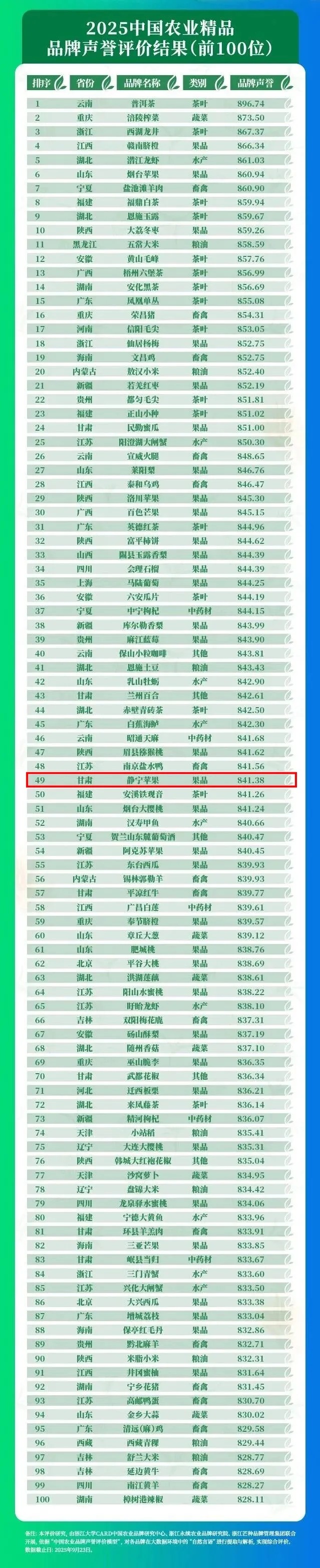 近日,在第二十二届中国西部(重庆)国际农产品交易会期间举办的“智慧农业驱动西部农业三产融合创新研讨会”上,《2025中国农业精品品牌声誉评价报告》正式发布。我市“甘味”品牌“静宁苹果”凭借841.38的品牌声誉,成功入选“2025中国农业精品品牌声誉TOP100”榜单,位列第49名。